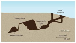 El yacimiento incluye una zona concreta —la cámara Dinaledi— a la que solo se accede tras un recorrido extremadamente complejo: pasajes estrechos, ascensos y descensos, y un pozo vertical de unos 12 metros.