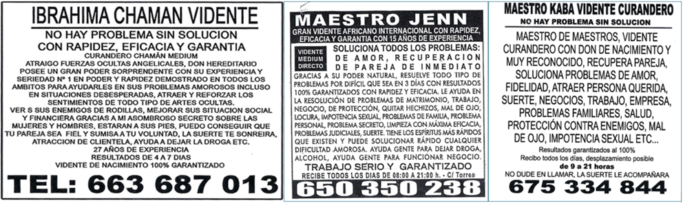- En el primer anuncio (IBRAHIMA CHAMAN VIDENTE), hay un énfasis en la «sabiduría secreta» y poderes heredados.
